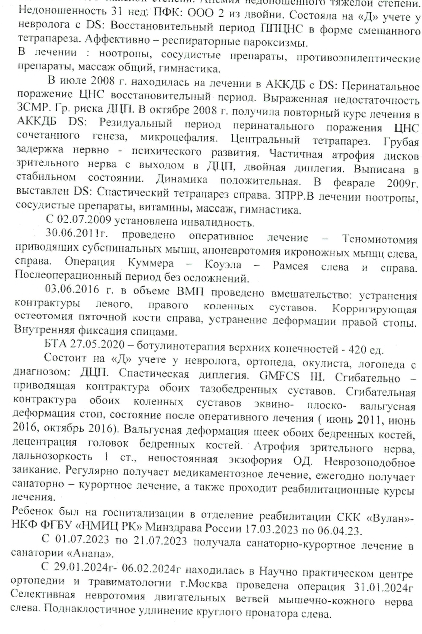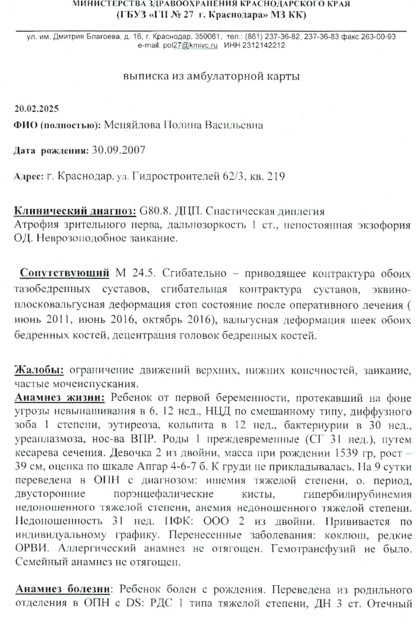 Полина, из Краснодара. Девочки-двойняшки, родились с маленьким весом 1,300 кг и 1,400 кг в очень тяжелом состоянии. Одна из сестер- Алиса выздоровела, а Полюшка получила диагноз ДЦП. Ребенок с рождения по больницам: бесконечные массажи, л.ф.к. и т.д., но это все дает положительную динамику! Полина учится в школе на домашнем обучении. Она прекрасный собеседник, умеет читать, считать, изучает английский язык, но проблема с заиканием. Девочка перенесла 3 операции на нижние конечности, 2 из которых сделали в июне и октябре 201б года, а четвертую операцию сделали 31.01.2024 года, что дало хорошие результаты. Врач, после операции, назначил Полине заниматься каждый день на беговой дорожке, но купить ее мама не может, т.к. воспитывает девочек одна, и сама является инвалидом 2 группы. Папа ушел из семьи, живет на Алтае, не работает и не помогает.