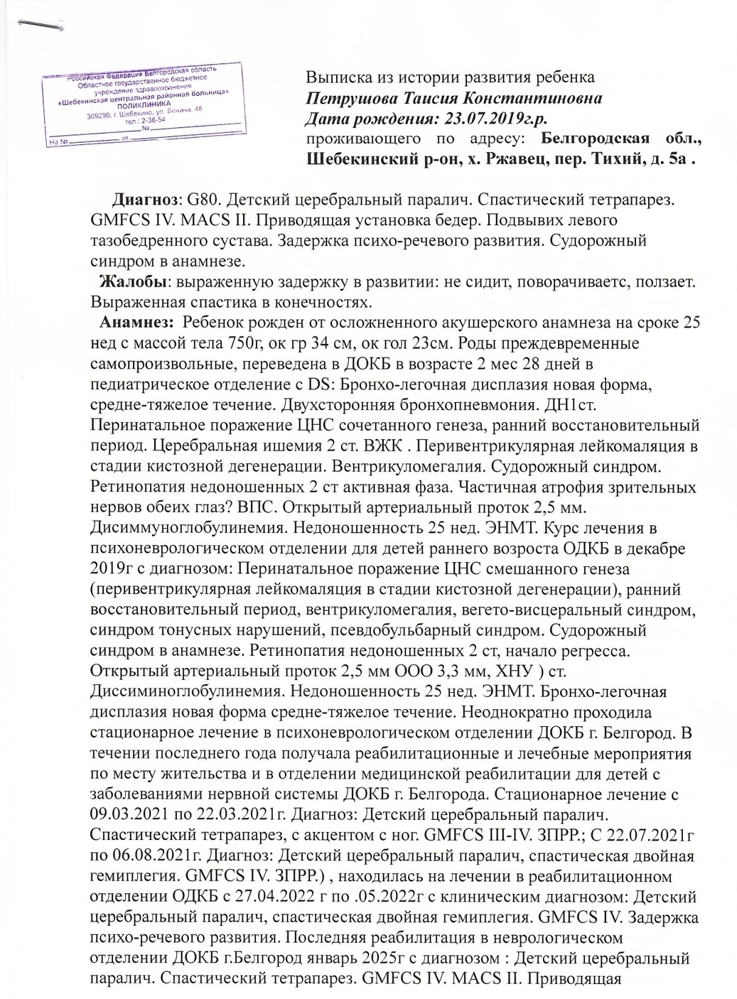Тая родилась на сроке 26 недель и весом всего 850 грамм. Сразу же после своего рождения ребенок был переведен в реанимацию на долгих три месяца. Таюша была на аппарате ИВЛ 50 дней, затем назальные канюли, сипап и маска, кушала Тая через зонд. Через три месяца девочка была переведена в отделение педиатрии, а затем в неврологию. Там ее учили кушать и дышать самостоятельно, ребенок был очень слабый. Таисия, после своего рождения, провела почти пол года в больнице. В год поставили диагноз ДЦП и оформили инвалидность. Сейчас ей шесть лет, она не сидит и не ходит самостоятельно. У ребенка сохранен интеллект. В 2024 году ей была проведена операция миофасцитомия, это 35 насечек скальпелем по всему телу, чтобы мышцам увеличить объем движения. Девочке нужна инвалидная коляска, в семье есть еще один ребенок, денег не хватает, т.к. работает только папа, а Таи постоянно нужно проходить реабилитацию, нужны лекарства, массажы и т.д. Коляска очень дорогая, для семьи просто не подъемная сумма.
